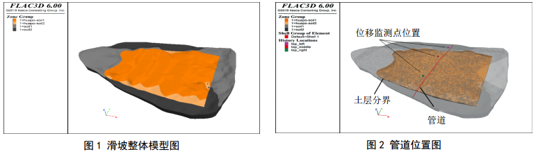復(fù)雜地形下的三維管道地質(zhì)災(zāi)害模擬一直是困擾數(shù)值模擬應(yīng)用于管道工程的難題,埋地管道與地質(zhì)災(zāi)害土體尺寸相差巨大,直接限制了模型網(wǎng)格劃分以及計(jì)算求解速度。以某山區(qū)管道滑坡災(zāi)害為例,開展了三維管道地質(zhì)災(zāi)害數(shù)值模擬。該滑坡體的坡面傾角為10°~12°,從坡腳至坡頂共分為五級(jí)坡坎。坡體主要有①層新黃土(粉土為主,稍濕,松散,透水),②層新黃土(粉土為主,濕~很濕,稍密~中密,液性指數(shù)>1.0,局部呈流塑狀態(tài),透水)。該滑坡體為牽引式滑坡,滑面位于 第②層新黃土中,管道埋深2 m左右。黃土參數(shù)如下:第①層黃土:土體體積模量Κ=65 MPa,內(nèi)聚力c=14.5 kPa,密度ρ =1950 kg/m3,內(nèi)摩擦角φ=22.5°,剪切模量G=30 MPa;第②層黃土:土體體積模量Κ=65 MPa,內(nèi)聚力c=18.23 kPa,密度ρ=1960 kg/m3,內(nèi)摩擦角φ=20°,剪切模量G=30 MPa。模擬管道鋼材為X70,彈性模量E=210 GPa,泊松比μ=0.3,密度ρ =7.98×103 kg/m3,最小屈服強(qiáng)度σ s=4.85×108 Pa,運(yùn)行壓力P=10 MPa,管道規(guī)格Φ=1016 mm×28 mm。通過Rhino軟件,采用完全耦合的方式建立雙地層的埋地管道三維地質(zhì)模型,整體模型長(zhǎng)度400 m左右,寬度300 m左右,在管道位置處進(jìn)行局部加密,并實(shí)現(xiàn)網(wǎng)格大小的平穩(wěn)過渡。由Griddle工具生成FLAC 3D網(wǎng)格,導(dǎo)入FLAC 3D設(shè)置單元屬性、邊界條件以及根據(jù)實(shí)際情況設(shè)置位移監(jiān)測(cè)點(diǎn)進(jìn)行數(shù)據(jù)監(jiān)測(cè)。通過數(shù)值求解計(jì)算,得到了滑坡發(fā)育過程中的土體變形以及管道力學(xué)響應(yīng)。三維地質(zhì)災(zāi)害模型如圖 1、圖 2所示。