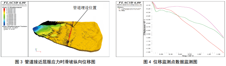 FLAC 3D數(shù)值模擬滑坡發(fā)育過程,在管道應(yīng)力接近管材屈服應(yīng)力時(shí)停止計(jì)算,得到滑坡整體位移以及位移監(jiān)測(cè)點(diǎn)的數(shù)據(jù)變化如圖 3、圖 4所示。滑坡整體縱向位移呈現(xiàn)坡度大、位移大的基本規(guī)律。由于該滑坡上半部分坡度最大,故最大位移位于滑坡體上半部分,在管道局部應(yīng)力接近屈服極限時(shí),滑坡體最大縱向位移下降可達(dá)8.65 m左右。在該滑坡中部位置,由于地下輸氣管道的存在,阻礙了滑坡土體的下滑,上部下滑土體在此發(fā)生堆積,該位置土體出現(xiàn)了隆起,地表縱向位移最大增加2.2 m左右,與此同時(shí),管道也因此發(fā)生變形,管道應(yīng)力迅速增加。該滑坡區(qū)域布置的三處縱向位移監(jiān)測(cè)點(diǎn)都位于管道上部,在滑坡發(fā)育過程中,監(jiān)測(cè)數(shù)據(jù)都先顯著減小,然后略微反彈,維持一段平穩(wěn)狀態(tài),然后監(jiān)測(cè)位移迅速下降;在三處位移監(jiān)測(cè)點(diǎn)中,粉色監(jiān)測(cè)點(diǎn)維持平穩(wěn)狀態(tài)最久,中間紅色監(jiān)測(cè)點(diǎn)后期縱向位移變化最劇烈。因此在工程實(shí)際中,當(dāng)三處監(jiān)測(cè)點(diǎn)的位移迅速降低時(shí),需要密切關(guān)注管道安全狀況,對(duì)該處滑坡管道采取緊急防護(hù)措施,防止管道發(fā)生損壞。
