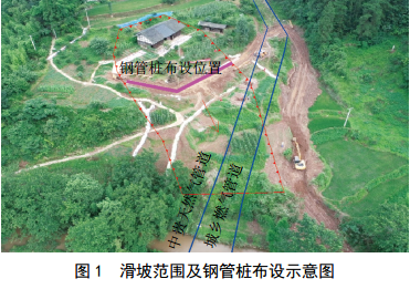 (3)采取鋼管樁支護(hù)措施。針對(duì)滑坡的穩(wěn)定狀態(tài)、滑坡周邊場(chǎng)地地形條件以及考慮施工的安全性,對(duì)滑坡采取了鋼管樁支護(hù)措施,在滑坡中后部設(shè)置了兩排鋼管樁,共計(jì)86根(圖 1)。