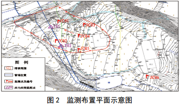 為進(jìn)一步分析、評(píng)價(jià)滑坡穩(wěn)定性,保證搶險(xiǎn)現(xiàn)場(chǎng)施工人員安全以及專項(xiàng)處置措施順利實(shí)施,采用了位移監(jiān)測(cè)、管道應(yīng)力應(yīng)變監(jiān)測(cè)和非接觸式磁異常檢測(cè)等全方位智能管控措施(圖 2)。