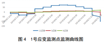 通過監(jiān)測(cè)數(shù)據(jù)表明,2019年8月1日后,1號(hào)應(yīng)變監(jiān)測(cè)點(diǎn)和2號(hào)應(yīng)變監(jiān)測(cè)點(diǎn)數(shù)據(jù)變化不明顯(圖 4、圖 5),各點(diǎn)的整體趨勢(shì)基本一致,應(yīng)變區(qū)間為﹣178~78,占極限值的7.73%,未達(dá)到關(guān)注級(jí)。