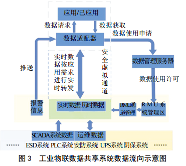 西南管道公司以中緬原油管道(國內(nèi)段)站場為試點(diǎn),建設(shè)了中緬原油管道工業(yè)物聯(lián)數(shù)據(jù)共享系統(tǒng),形成西南管道公司自有的工業(yè)數(shù)據(jù)共享管理系統(tǒng)。該 系統(tǒng)采用分布式架構(gòu),不設(shè)統(tǒng)一數(shù)據(jù)中心,以“去中心化”的方式將站場的生產(chǎn)數(shù)據(jù)本地存儲;同時(shí),應(yīng)用“詢問—應(yīng)答”工作機(jī)制,為站場的工業(yè)設(shè)備提供端到端的鏈路管理,可以根據(jù)不同應(yīng)用對工業(yè)數(shù)據(jù)的需求,有針對性地提供數(shù)據(jù)服務(wù)。該系統(tǒng)的優(yōu)點(diǎn)是:減輕企業(yè)數(shù)據(jù)中心的壓力;通過統(tǒng)一平臺向各應(yīng)用提供運(yùn)行基礎(chǔ)數(shù)據(jù),避免設(shè)備本體的應(yīng)答沖突;通過設(shè)置不同的訪問權(quán)限,可以達(dá)到不同范圍的數(shù)據(jù)應(yīng)用。 圖 3所示為工業(yè)物聯(lián)數(shù)據(jù)共享系統(tǒng)的數(shù)據(jù)流向示意圖。