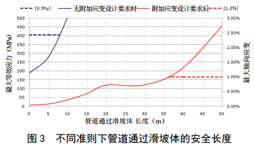 不穩(wěn)定斜坡風(fēng)險(xiǎn)形成的位移載荷具有自限性,類似的載荷為穿越斷層的位移載荷,但與穿越斷層不同的是,坡體失穩(wěn)發(fā)生的位置及形態(tài)更具不確定性。借鑒穿越活動(dòng)斷層段管道設(shè)計(jì)經(jīng)驗(yàn),通過一系列技術(shù)措施可提高管道承受附加土體位移載荷的能力。在山區(qū)管道沿線不穩(wěn)定斜坡風(fēng)險(xiǎn)較高地段,可改變管道設(shè)計(jì)準(zhǔn)則,以應(yīng)變?yōu)闇?zhǔn)則來增強(qiáng)相應(yīng)風(fēng)險(xiǎn)承載能力。以上述外徑559 mm管道為例,在考慮附加技術(shù)措施后管道允許應(yīng)變能力可以達(dá)到1%,管道承載土體位移變形能力可得到較大改觀。通過滑坡體的安全長(zhǎng)度從6 m增至35 m,如圖 3所示,有效提高了管道在該類風(fēng)險(xiǎn)發(fā)生時(shí)的承載能力,可為后續(xù)應(yīng)對(duì)或應(yīng)急贏得時(shí)間。