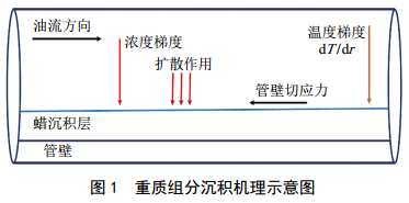 首先需要建立山地管道重質(zhì)組分沉積預(yù)測(cè)模型。重組分的沉積過(guò)程是多種機(jī)理混合作用的結(jié)果,其中分子擴(kuò)散、油流剪切和老化作用對(duì)輸油管道中重組分沉積層的形成有較大影響,重質(zhì)組分沉積的物理模型如圖 1所示。