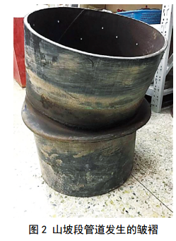 圖 1為臨近道路施工誘發(fā)山體滑坡,開挖后的管道發(fā)生明顯移位。圖 2為某管道山地敷設(shè)段因滑坡而發(fā)生皺褶,引發(fā)了介質(zhì)泄漏。從山地管道失效案例可以總結(jié)管道失效原因:一是對管道受到的外部載荷估計不足,往往是管道發(fā)生事故之后,才意識到管道受到嚴重的載荷作用;二是管道的應(yīng)變能力不足,土體擾動即可能導(dǎo)致管道失效;三是管道的防護結(jié)構(gòu)(如擋土墻等)保護能力不足,某些因素可能致其先行損壞,未能對管道起到足夠的防護作用。