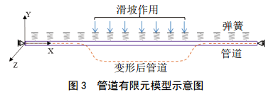 山地管道的力學(xué)行為往往是復(fù)雜的,采用解析計算方法較難處理此類問題,而采用有限元方法較為可行[4],這也是目前普遍采用的方法。在有限元方法中,管土間相互作用采用土彈簧模型化,通過彈簧的剛度及自由度反映土質(zhì)類型及土體運動形式,包括軸向、橫向及豎向土彈簧,軸向土彈簧反映了土體與管道間的軸向作用力及位移關(guān)系,橫向及豎向土彈簧反映了土體與管道的橫向作用力與位移關(guān)系。