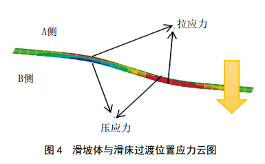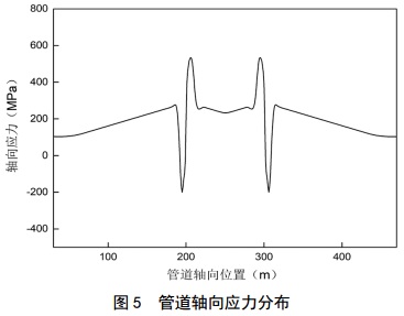 有限元分析得到管道的應(yīng)力分布情況如圖 4及圖 5所示。從圖 4可以看到,在滑坡體與滑床過渡位置為應(yīng)力突變處,管道A、B側(cè)的應(yīng)力均發(fā)生了由受拉應(yīng)力到受壓應(yīng)力的轉(zhuǎn)變,該處位置是管道的危險段,如果管道的變形較大,可能會在該處發(fā)生斷裂。圖 5為從管道B側(cè)提取得到的軸向應(yīng)力分布情況,從圖中可以看到,應(yīng)力在滑坡體與滑床過渡位置發(fā)生顯著變化。最大壓應(yīng)力位于滑床區(qū)域,其值為200 MPa,最大拉應(yīng)力位于滑坡體內(nèi),其值為528 MPa,此應(yīng)力已經(jīng)超過管道屈服強度,發(fā)生塑性變形,應(yīng)采取必要的措施降低管道受到的應(yīng)力。