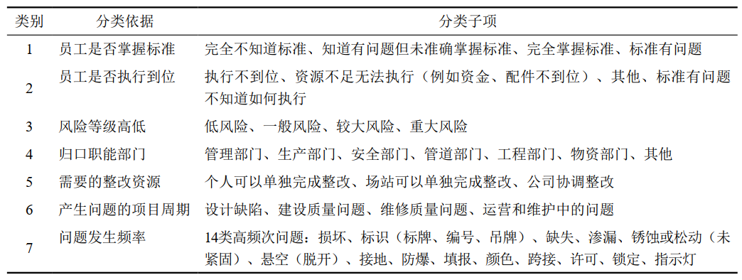 參考危化品行業(yè)“低老壞”問題七個維度,即員工工作能力、員工工作態(tài)度、問題的風險等級、問題的歸口職能部門、問題整改所需資源、問題產(chǎn)生階段、問題集中和重要程度,結合分公司實際情況,提出管理假設,制定新的分類方式,如表 1所示。
