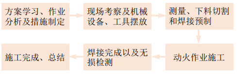 換管作業(yè)前組織所有作業(yè)人員認(rèn)真溫習(xí)焊接工藝規(guī)程和焊接作業(yè)方案,將焊接作業(yè)流程熟記于心。掌握各自工作范圍、職責(zé)及作業(yè)內(nèi)容,每個(gè)步驟或工序標(biāo)準(zhǔn)及驗(yàn)收要求,合理分組并列出所需施工設(shè)備、工具和檢測(cè)器具(圖 1)。