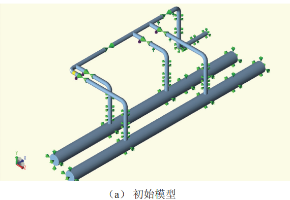 CAESAR Ⅱ軟件是美國COADE公司開發(fā)的管道應(yīng)力分析專業(yè)軟件,是以梁?jiǎn)卧P蜑榛A(chǔ)的有限元分析軟件[3]。應(yīng)力分析主要步驟為:數(shù)據(jù)輸入與建模、設(shè)定工況、模型檢查、分析計(jì)算等。為開展管道系統(tǒng)應(yīng)力分析、彈簧支架初始載荷設(shè)置和選型、管道沉降監(jiān)測(cè)提供依據(jù)。