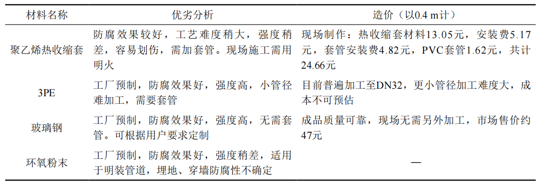 穿墻、穿樓板位置燃?xì)夤艿栏g漏氣主要集中在入戶管穿廚房外墻和表后管穿生活陽(yáng)臺(tái)墻壁等處, 目前管道防腐多采用施工現(xiàn)場(chǎng)制作工藝,對(duì)施工人員技能要求較高。如穿墻位置的燃?xì)夤艿婪栏L(zhǎng)度為30 ㎝左右,冷纏防腐膠帶6~8圈,兩端無(wú)固定。冷纏防腐膠帶的黏性與溫度有較大的關(guān)系,經(jīng)歷冬季后會(huì)慢慢松動(dòng)甚至脫落,使防腐性能下降,因雨水、水蒸氣等進(jìn)入后造成點(diǎn)蝕漏氣。比較不同材料常用防腐工藝優(yōu)劣,選擇以玻璃纖維增強(qiáng)塑料(玻璃鋼)為預(yù)防腐層的新型預(yù)制防腐管件,詳見(jiàn)表 2。