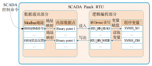 (1)RTU功能結(jié)構(gòu)。清管站 RTU將功能分為相對獨(dú)立的兩部分,即完成數(shù)據(jù)通訊和邏輯編程,分別使用 SCADAPack E Configurator 和 SCADAPack Workbench 兩個(gè)軟件進(jìn)行配置和編程。如圖 3所示,數(shù)據(jù)在通訊部分和邏輯編程部分的傳送,讀、寫是單向的。讀、寫函數(shù)配置完成后,不能對同一地址點(diǎn)既讀又寫。