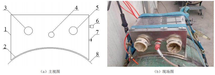 為保證焊接人員不影響操作箱體的密封性能,操作箱體開設(shè)第一操作孔、第二操作孔及密封容置孔。第一操作孔和第二操作孔分別連接密封手套,從箱體外側(cè)將密封手套伸入箱內(nèi),執(zhí)行焊接操作,并保證過程中箱體內(nèi)外隔離。密封容置孔內(nèi)設(shè)置焊接設(shè)備密封件,箱外側(cè)設(shè)置焊槍密封管,用于密封氬弧焊槍或者附屬線纜等。第一操作孔箱體外側(cè)和第二操作孔箱體外側(cè)分別設(shè)置過渡管,密封手套尾部通過環(huán)箍固定在過渡管上,穩(wěn)定固定,可在高密封條件下順利實現(xiàn)焊接操作。為準(zhǔn)確把握焊接時機和便于拆卸,操作箱體上設(shè)置了氣壓表和泄壓閥。