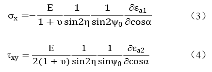 假定試樣表面平面應力狀態(tài)下,表面法線方向的剪切應力τ13、τ23為零,即殘余應力的計算表述為: