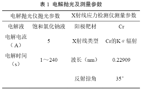 基于cosα法的X射線衍射檢測技術(shù),采用u-X360便攜式X射線應力檢測儀。管道表面處理采用電解拋光儀,電解拋光及測量參數(shù)見表 1。