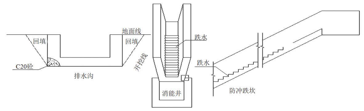 實踐證明,將排水溝(圖 5)、錨固、抗滑樁(圖 6)、擋土墻(圖 7)、削方減載壓腳等,兩種及以上措施相結合用以治理滑坡、不穩(wěn)定斜坡,可取得良好成效。坡面水毀治理常采用截排水溝、擋墻、截水墻等。河溝道水毀主要采用護岸(圖 7)、過水面、地下防沖墻等措施。修建水工保護設施要結合地質特征、特點,因勢利導,要以疏水排水為原則,堅決不能以堵代疏。巖溶塌陷常采用清除填堵、灌漿加固、結構跨越的方式進行處理。小型塌陷一般以清除填堵為主。開挖難度較大的塌陷可將水泥砂漿、混凝土等材料通過巖溶洞口灌入洞隙中,以強化土層、洞空填充物,隔斷地下水通道。采用疏、導、排、圍等措施以阻止地表水下滲也很重要。