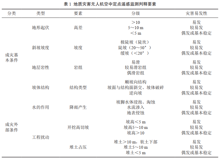 利用多旋翼無人機進行空中定點遙感監(jiān)測,并對無人機遙感影像資料進行處理,查明管道周邊地質(zhì)環(huán)境是否具備地質(zhì)災害的成災條件,確認工程擾動的范圍和強度,是否誘發(fā)地質(zhì)災害。在此基礎上,確定隱患問題的類型和發(fā)生條件及對管道的影響和危害程度(表 1)。