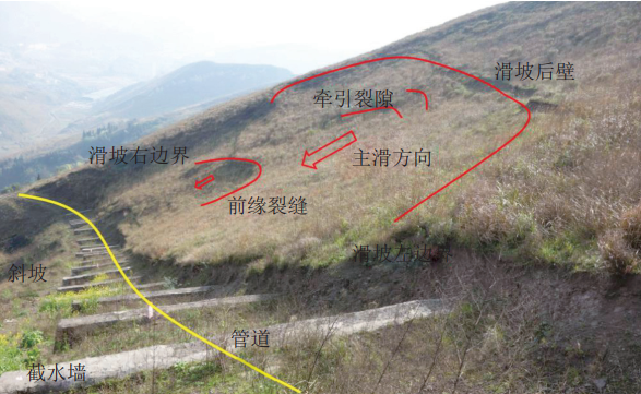 某管道敷設于桐梓縣貓頭山區(qū)ZY074+500米斜坡變形處,經(jīng)勘探確認,管道上方斜坡發(fā)育為長70 m、寬80 m、前后緣最大高差約25 m的淺表層土質(zhì)滑坡。不穩(wěn)定斜坡平均坡度為24°,四周相對較高,地貌上為淺型凹地,具有較好的匯水條件。斜坡體表面堆積層覆蓋,結(jié)構(gòu)松散,基巖結(jié)構(gòu)面與斜坡坡面斜交。