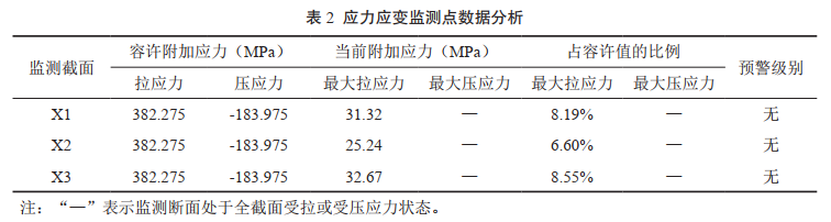 如圖 3所示,在管道外壁A、B、C 3個監(jiān)測點安裝應變計測量各點應變值,即可計算管道截面內(nèi)任意點的應變值大小,由胡克定律,計算得到監(jiān)測截面的最大應力值。據(jù)此可長期監(jiān)測管道截面實時應力大小及變化趨勢。按照QSY 1672―2014《管道滑坡災害監(jiān)測規(guī)范》,將管道地質(zhì)災害風險分為藍色、黃色、紅色三個等級預警,對應的管道附加應力達到管道拉(壓)應力允許值分別為30%、60%、90%。