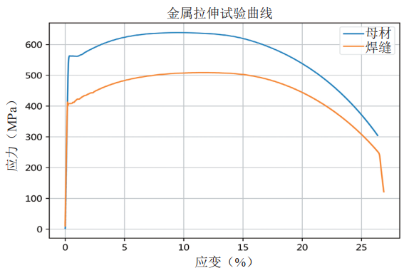 圖 2 焊縫及母材的拉伸曲線