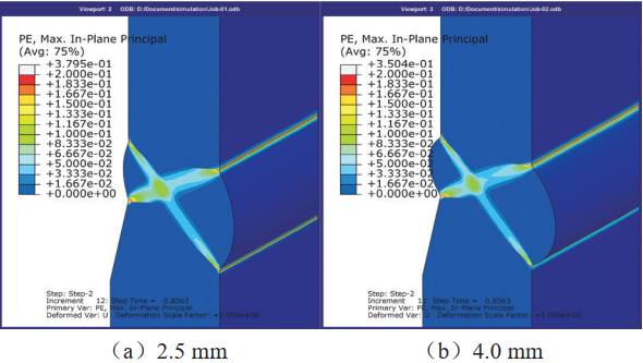 有限元模擬結(jié)果與DIC試驗(yàn)結(jié)果均表明塑性變形集中在“X”形區(qū)域內(nèi),應(yīng)變集中區(qū)域與焊縫焊后余高無重合部分。利用有限元模擬焊接所形成的不同焊后余高對(duì)應(yīng)變大小及分布的影響見圖 5, 2.5 mm焊后余高焊接接頭的應(yīng)變特征與4.0 mm焊后余高焊接接頭的應(yīng)變特征相似,均為“X”形分布,焊后余高所增加的部分材料對(duì)應(yīng)變分布的形態(tài)和應(yīng)變分布的絕對(duì)值影響較小。