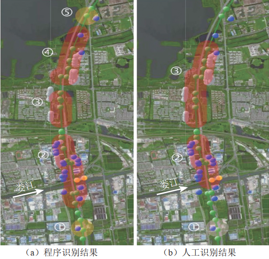 從對比情況來看,程序共識別出Ⅲ級高后果區(qū)3處、I級高后果區(qū)2處,人工識別出Ⅲ級高后果區(qū)2處、Ⅱ級高后果區(qū)1處,主要區(qū)別如下:圖 6(a)中高后果區(qū)①和(b)中高后果區(qū)①范圍基本相同,涵蓋大公小學(xué)(特定場所I),但高后果區(qū)等級不同,分別為I和Ⅱ級,主要原因是西氣東輸作業(yè)指導(dǎo)書中對人口密度與建筑物密度換算有更高的要求[16];圖 6(a)高后果區(qū)②為圖5中Ⅲ級、Ⅱ級和I級高后果區(qū)合并得到的,而(b)中高后果區(qū)②未覆蓋到婁江以南的I級高后果區(qū),可能是由于人工劃分失誤導(dǎo)致;(a)中③和④不符合合并條件,但在人工劃分中將兩者合并,人為擴大了Ⅲ級高后果區(qū)范圍;(a)中④北部區(qū)域?qū)商幪囟▓鏊鵌一并納入,而(b)中③可能由于人為劃分失誤未予以統(tǒng)計。程序劃分相比人為劃分可在一定程度上減少人為劃分失誤因素,為精準(zhǔn)快速的高后果區(qū)劃分提供參考。