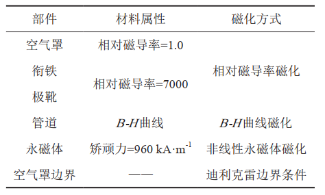 采用COMSOL軟件來模擬漏磁檢測過程,結(jié)合文獻(xiàn)[6,7]中的研究和實(shí)際檢測裝置,建立了如圖 2所示的有限元模型及網(wǎng)格劃分。為簡化模型,這里采用平板代替管子,并在外圍構(gòu)建空氣罩模擬磁場在空氣中的分布情況。缺陷Ω采用半橢球凹坑來表征,缺陷參數(shù)分別為凹坑直徑L和凹坑深度D,即一個管道缺陷可表示為Ω(D, L)。表 1給出了模型中各部件材料屬性、磁化方式以及邊界條件定義。