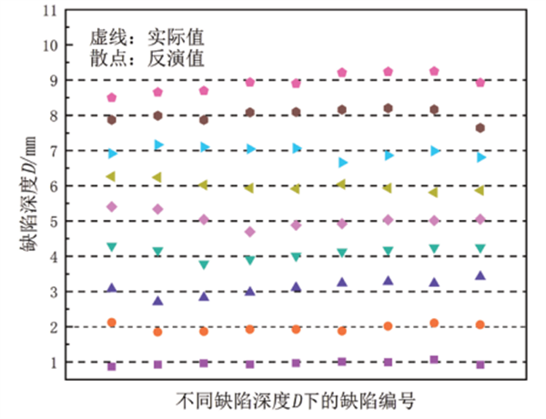 圖 8中虛線表示缺陷的實(shí)際尺寸,樣本點(diǎn)表示通過神經(jīng)網(wǎng)絡(luò)算法進(jìn)行缺陷反演得到的缺陷尺寸。由結(jié)果可以看出,本文的反演方法可以準(zhǔn)確地量化缺陷尺寸,相對誤差幾乎都在10%以下,絕大部分誤差在5%左右。同時,為進(jìn)一步驗(yàn)證此反演方法的可靠性和準(zhǔn)確性,本文隨機(jī)選取了5組缺陷帶入訓(xùn)練結(jié)果進(jìn)行反演,得到結(jié)果如表 2所示。可見,本文提出的缺陷量化方法精確度較高,可為實(shí)際工程中缺陷反演提供新的思路和理論支持。