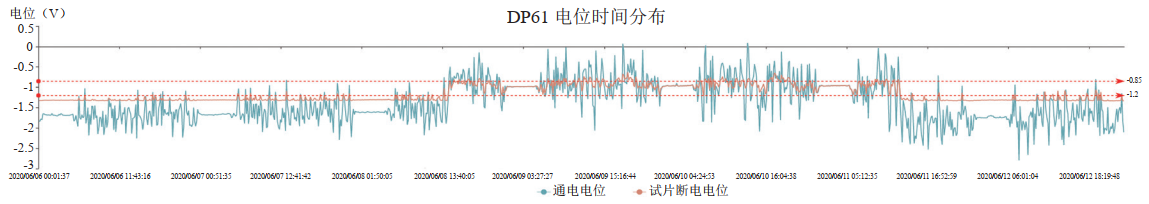 (4)鄰近管道恒電位儀運(yùn)行狀態(tài)對管道電位的影響。2020年6月8日至6月11日,DP61智能測試樁通/斷電電位正向偏移且IR降發(fā)生明顯變化,經(jīng)核實(shí),為DP管段鄰近管道2#閥室恒電位儀意外停機(jī)所致(圖 2)。