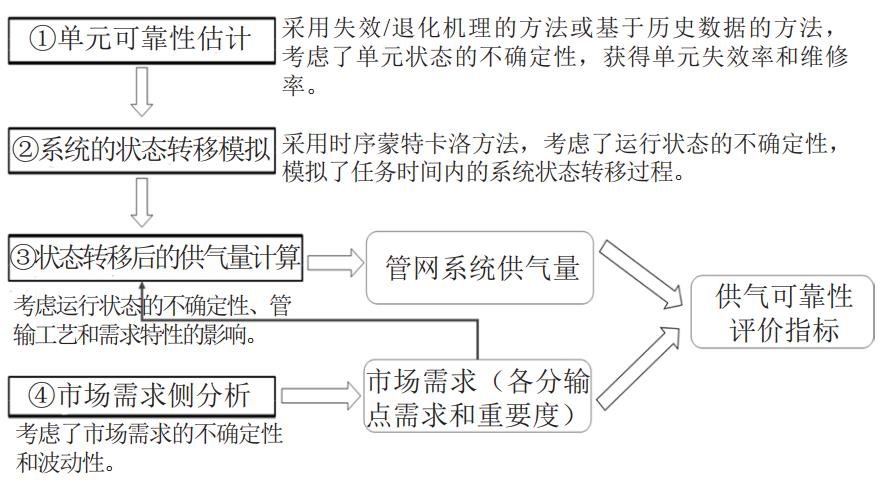 由此可知,盡管國內(nèi)外對于管網(wǎng)系統(tǒng)可靠性已經(jīng)開展了卓有成效的研究,但對于天然氣需求的波動特征以及用戶重要度的影響還缺乏考慮。基于此,本文提出考慮需求側(cè)影響的天然氣管網(wǎng)系統(tǒng)可靠性評價方法,實現(xiàn)了可靠性評價與管網(wǎng)水力計算和市場需求側(cè)分析的結(jié)合,彌補(bǔ)了傳統(tǒng)天然氣管網(wǎng)系統(tǒng)可靠性評價中缺乏考慮需求側(cè)影響的不足,其研究框架如圖 1所示。