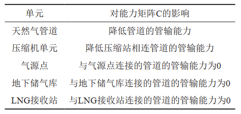 由于系統(tǒng)中單元的隨機(jī)失效和維修活動,會改變管網(wǎng)系統(tǒng)的能力矩陣C,導(dǎo)致系統(tǒng)的供氣量發(fā)生變化。管網(wǎng)系統(tǒng)中不同類型單元的失效對能力矩陣C的影響如表 2所示。