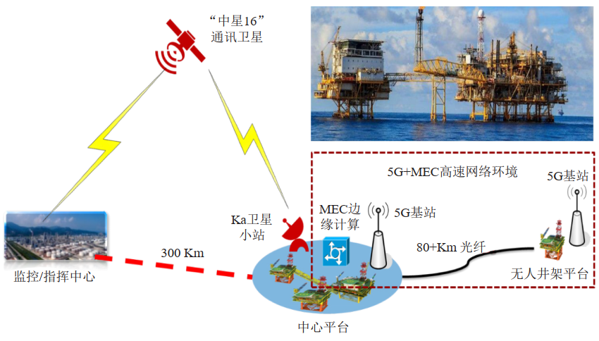 試點區(qū)域由陸地監(jiān)控指揮中心、海上中心鉆井平臺和無人井架平臺組成。在中心平臺搭建5G無線局域網(wǎng),并通過海底光纜與80公里外的無人井架上的5G無線局域網(wǎng)聯(lián)通。鉆井平臺設(shè)施/設(shè)備的監(jiān)控數(shù)據(jù)匯聚于中心平臺MEC邊緣計算節(jié)點,經(jīng)過信息提取和智能診斷,抽象出實時運(yùn)行狀態(tài)報告,通過衛(wèi)星鏈路上傳給陸地監(jiān)控指揮中心。監(jiān)控指揮中心信息也可通過此通信網(wǎng)絡(luò)對海上平臺設(shè)施/設(shè)備實施遠(yuǎn)程控制。