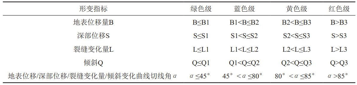 滑坡監(jiān)測可能安裝多種不同類型的監(jiān)測設(shè)備,且因每個滑坡具有獨特性,預(yù)警判據(jù)值需根據(jù)監(jiān)測滑坡點位的具體現(xiàn)場工況綜合提出。本文沿用改進切線角方法求取的滑坡地表位移切線角、深部位移切線角、裂縫切線角以及傾斜量切線角作為每一種監(jiān)測設(shè)備的單指標(biāo)預(yù)警判據(jù),每個判據(jù)均包含綠色級、藍(lán)色級、黃色級和紅色級,如表 2所示。而滑坡的綜合預(yù)警等級的確定采用最不利原則,將多種監(jiān)測設(shè)備所達(dá)到的最高預(yù)警級別作為滑坡綜合預(yù)警等級。