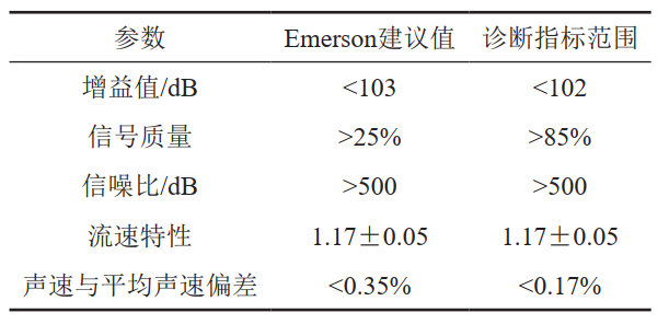 實時監(jiān)測5個基本參數(shù)值并與Emerson廠家建議的診斷參數(shù)標(biāo)準(zhǔn)對比,可以發(fā)現(xiàn)流量計各聲道相應(yīng)數(shù)據(jù)與診斷指標(biāo)的差異,據(jù)此可初步判斷數(shù)據(jù)異常聲道可能存在臟污或探頭故障等,需對相應(yīng)探頭進行拆檢,清除探頭表面臟污或者更換、調(diào)整探頭參數(shù)。定期進行聲速核查,基本可以辨別超聲波流量計的整體表現(xiàn)。Emerson廠家建議的診斷參數(shù)標(biāo)準(zhǔn)如表 1所示。
