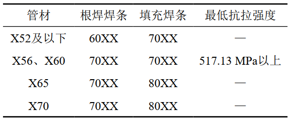 (4)焊條選型。阿美標(biāo)準(zhǔn)規(guī)定在役焊接一般采用低氫堿性焊條而不用纖維素焊條,不同鋼材等級管道應(yīng)選擇的焊條最低抗拉強度[2]如表 2所示。