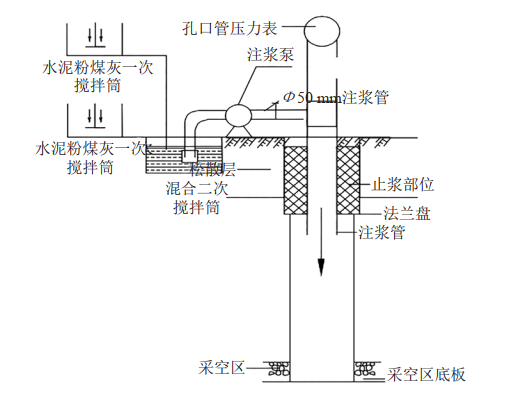 (6)鉆孔封孔。對未鉆至采空區(qū)的鉆孔,采用水灰比為 0.5∶1 的單液水泥漿封孔,鉆至采空區(qū)的鉆孔暫不封孔,留作后期注漿孔使用。