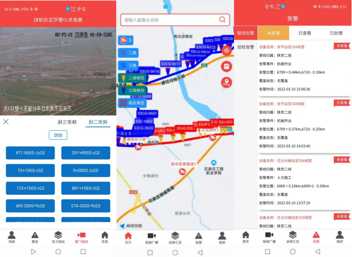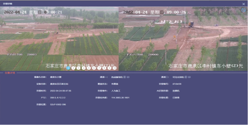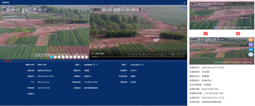 石家莊輸油氣分公司地處“京津冀”要地,天然氣管道穿越高鐵、高速公路、河道、人口密集型高后果區(qū)情況普遍,第三方施工損壞風險較高。2021年對陜京二線259公里管道啟用光纖振動預警系統(tǒng),在傳統(tǒng)的人機聯(lián)防模式下,巡護工接到電話或告警短信后到達事發(fā)現(xiàn)場,作業(yè)區(qū)管道管理人員根據(jù)現(xiàn)場風險等級給出處理措施并協(xié)調(diào)相關資源。由于光纖預警系統(tǒng)穿越區(qū)域條件復雜,誤告警情形難以避免,導致大量無效人力物力成本的付出。還由于巡護工到達現(xiàn)場存在時間差,無法及時防范管道損壞事件的發(fā)生。2022年石家莊輸油氣分公司利用陜京二線周邊2公里范圍內(nèi)的中國鐵塔公司存量高清攝像機,采取光纖預警與視頻監(jiān)控兩者聯(lián)動,結合人工智能識別技術,用較低成本解決了這一難題。