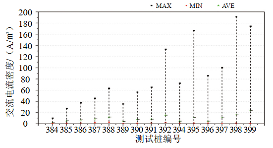 (2)在管道交流干擾峰值的2個位置采取干擾防護措施,可將全線管道的交流電流密度降至30 A/㎡內(nèi),建議在388#和393#測試樁處增加70 m和40 m鋅帶排流措施。