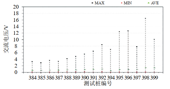 管道交流電壓和交流電流密度測試結(jié)果見圖 3,管道沿線的交流電壓在0~16.47 VCSE,交流電流密度平均值分布在2.06 A/㎡~23.65 A/㎡。圖 4為391#測試樁24 h交流電壓測試結(jié)果,結(jié)果顯示此段管道存在動態(tài)交流雜散電流干擾,在白天時間段交流電壓和電流密度波動較大,夜間時間段波動較小,判斷目前管道的交流干擾主要是電氣化鐵路造成的。