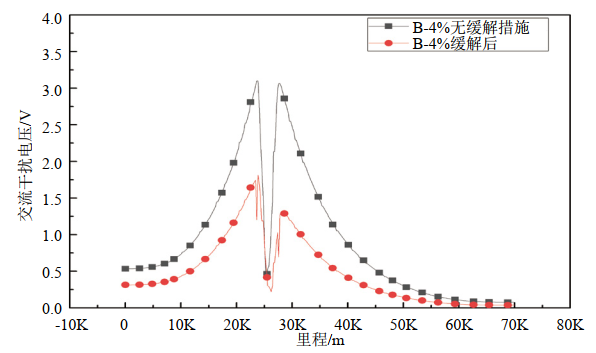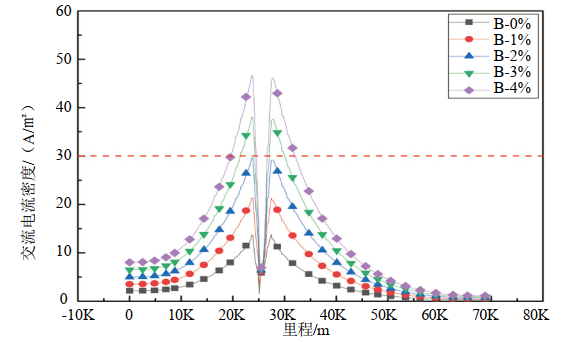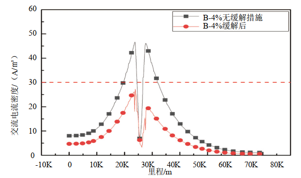 在輸電線路B相不平衡度為4%時,管道部分位置的交流電流密度高于30 A/㎡,根據(jù)國內(nèi)外評價指標規(guī)定,本次干擾緩解目標為輸電線路造成的交流電流密度小于30 A/㎡。