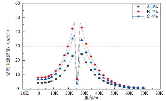 在不同相位的不平衡度分別達到4%,管道沿線的交流電壓和交流電流密度模擬計算結(jié)果見圖 6。結(jié)果顯示,不同相保持不平衡度時,管道的交流干擾程度差異性較大,其中在B相不平衡度為4%時,管道受到的交流干擾最大。