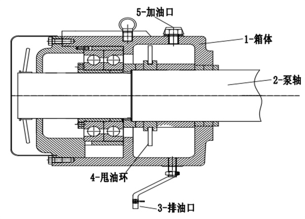 輸油主泵潤滑系統(tǒng)一般由潤滑油箱、加油口、排油口、甩油環(huán)等組成(圖 1),兩端的軸承均安裝在潤滑油箱中并添加適用的潤滑油進行潤滑。泵在快速轉(zhuǎn)動時,潤滑油會飛濺到槽內(nèi),通過回油孔流入軸承內(nèi)部,循環(huán)使用,軸承壓蓋和回油孔阻止了潤滑油的滲漏[2]。軸承潤滑方式為油環(huán)甩油潤滑,根據(jù)泵軸尺寸及潤滑油箱油量的不同,甩油環(huán)的工作淹沒油位應(yīng)高出甩油環(huán)的底部3 mm~6 mm。如果低于油環(huán)內(nèi)徑,油環(huán)挑不起油來會造成軸承潤滑惡化。作業(yè)人員應(yīng)當(dāng)按照規(guī)定檢查輸油主泵潤滑油箱液位及潤滑油質(zhì)量,通過油窗觀察軸承箱內(nèi)潤滑油的油位應(yīng)處于1/2~2/3;如果潤滑油變質(zhì)乳化或者軸承損壞會造成油質(zhì)變?yōu)槿榘咨蛘吆谏砻鳚櫥褪3],此時需要更換潤滑油。正常情況下,輸油主泵每運行2000 h或長期備用的輸油主泵每半年需清洗泵機組潤滑油箱,更換潤滑油。潤滑油箱上部設(shè)加油口、底部設(shè)排油口,更換潤滑油時先排凈舊潤滑油,目前采用人工加注方式。