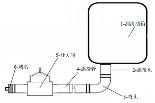 (1)連接頭進口端與潤滑油箱排油口、連接頭出口端與彎頭進口端固定密封連接。連接頭大小根據(jù)排油口內(nèi)絲大小決定,可分別為約25 mm(3/4寸)或33 mm(1寸)。