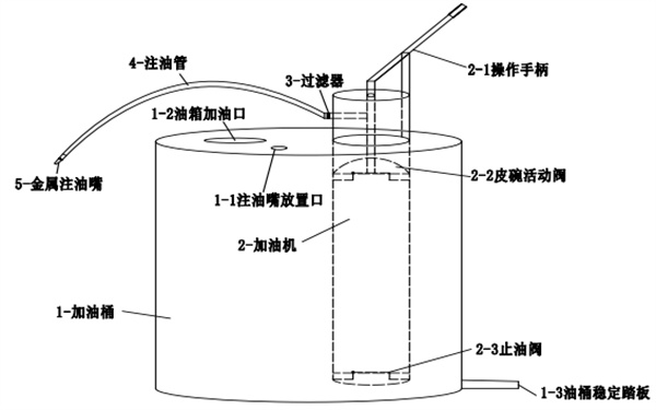 (1)加油桶選擇加厚桶,在其頂部設(shè)置注油嘴放置口和加油口,并加裝快開式密封蓋,底部設(shè)置油桶穩(wěn)定踏板。