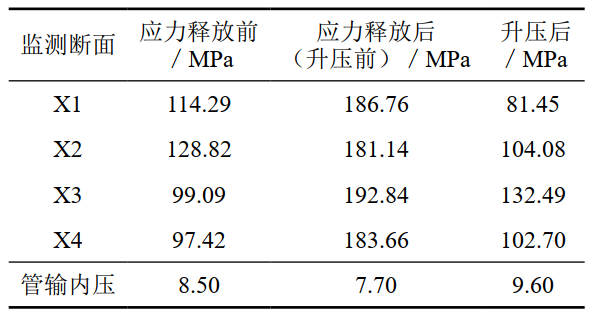 (3)施工過程中,在隧道洞口彎頭上下游布置監(jiān)測點。應力監(jiān)測結果表明,管輸內壓對于管道應力變化影響明顯。同等壓力工況下對比,實施治理措施后管道應力水平得到一定程度的降低,應力安全裕量得以提升,如表 1所示。