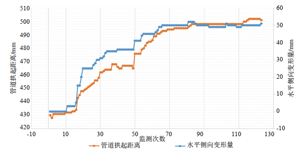 (4)雖然管道應力得到釋放,管道豎向和水平變形并沒有減小,尤其是當隧道底部土體約束解除之后,在下部疊加彎頭位移作用下,更加劇了管道水平位移。監(jiān)測顯示,當管輸壓力從7.36 MPa升壓到9.56 MPa過程中,管段豎向位移拱起501 mm,側向位移增加51 mm,如圖 4所示。