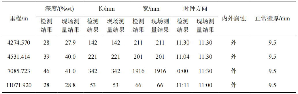 改造后的漏磁檢測(cè)器突破了以往最低運(yùn)行速度不能小于0.5 m/s的限制,成功應(yīng)用到蘇丹三段原油超低流速管道內(nèi)檢測(cè)作業(yè)中,現(xiàn)場(chǎng)開挖驗(yàn)證結(jié)果與漏磁檢測(cè)器檢測(cè)結(jié)果一致。