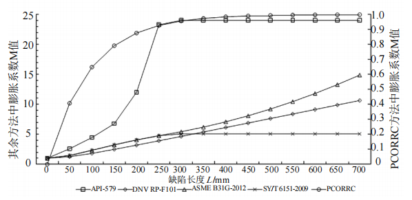 采用文獻[11]中的數(shù)據(jù)進行分析,分別使用ASME B31G―2012、DNV RP-F101、PCORRC、SY/T 6151―2009、API-579來對比腐蝕長度L對膨脹系數(shù)M的影響,如圖 2所示。