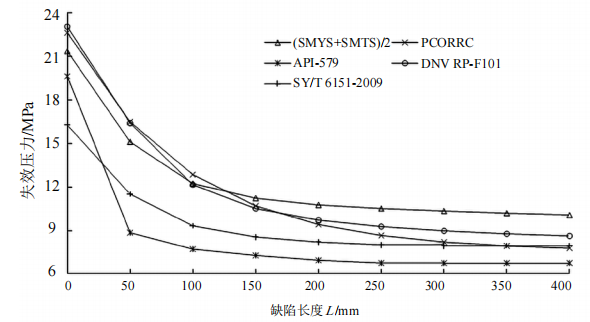 (2)當缺陷長度小于某一數(shù)值時,上述五種方法的評價保守性從低到高依次為DNV RP-F101、PCORRC、ASME B31G-2012、SY/T 6151―2009、API-579;大于該值時,總體來說評價方法的保守性從低到高依次為B31G、DNV RP-F101、PCORRC、SY/T 6151―2009、API-579。