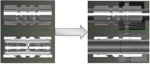 根據(jù)金屬力學(xué)特性和金屬塑性變形原理,將連接件主體與管道表面高強(qiáng)度壓合,實(shí)現(xiàn)純機(jī)械連接。首先,液壓工具推動(dòng)外套軸向向前擠壓,外套內(nèi)斜面對連接件主體向內(nèi)環(huán)形均勻擠壓,造成主體結(jié)構(gòu)塑性變形,外套自防脫結(jié)構(gòu)可以保持主體結(jié)構(gòu)永久不回彈。其次,主體內(nèi)部密封環(huán)均勻嵌入管體內(nèi)表面,同時(shí)主體內(nèi)表面也與管體表面壓接貼合,最終形成耐高壓抗振動(dòng)的高強(qiáng)度純金屬連接(圖 1)。